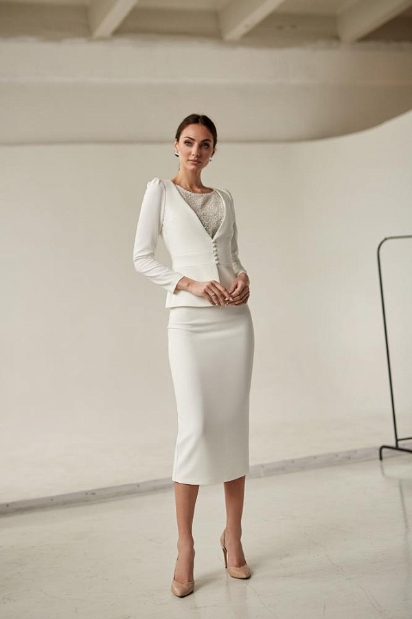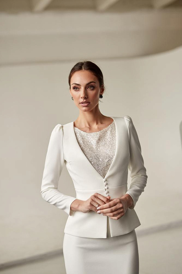 Свадебный жакет из плотной костюмной ткани добавит в образ элегантности. Можно сочетать с любыми юбками, брюками, топами и платьем Мосс