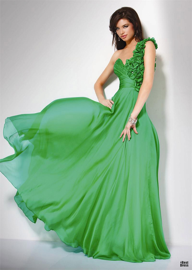 Бретель через одно плечо искусно украшена цветами из ткани платья, акцентированными кристаллами.