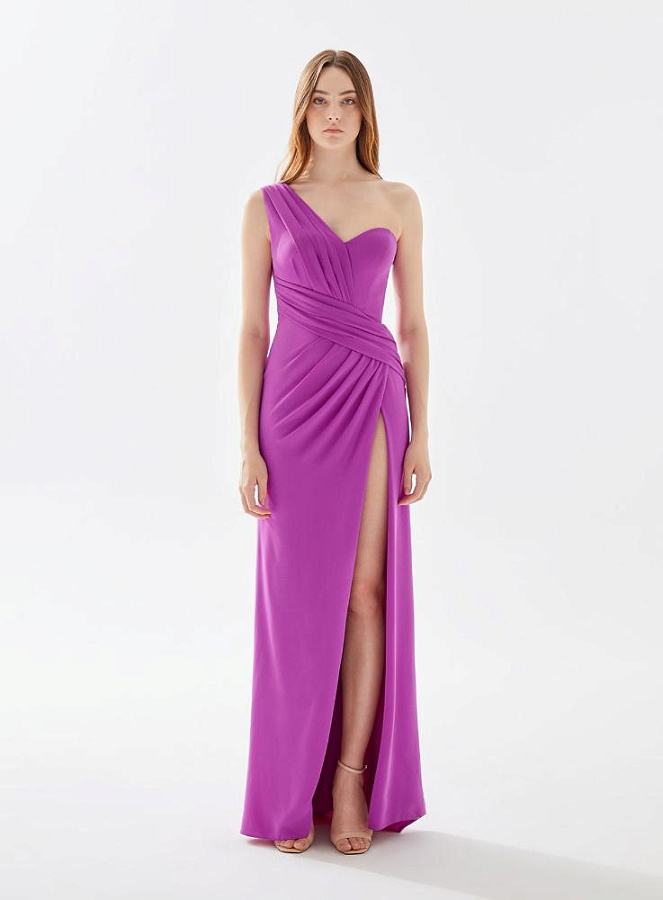 Запомните надолго это потрясающее платье от Tarik Ediz 52023. Оно создает иллюзию платья с запахом, которое предлагает классический вид наряду с драпированным дизайном. Платье с вырезом на одно плечо и без рукавов. Облегающий лиф этого платья в полный рост выглядит завораживающе, поскольку заканчивается высоким разрезом по ноге.