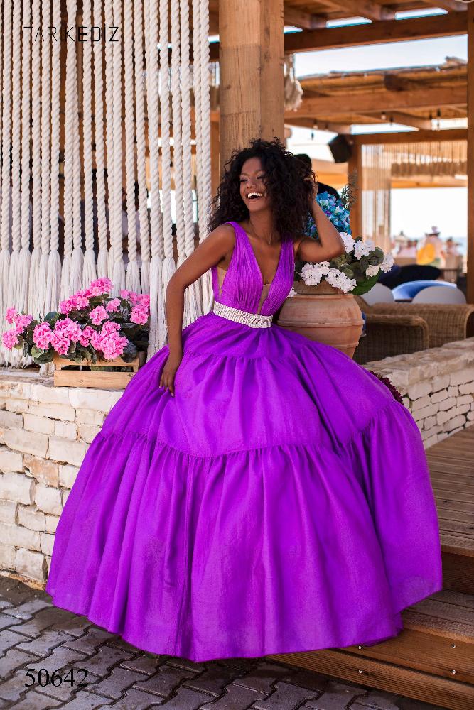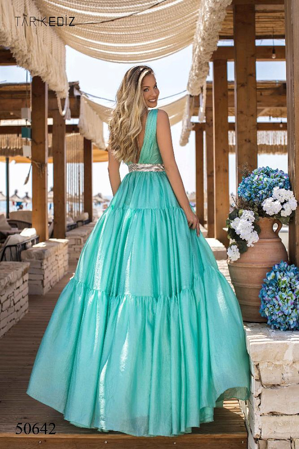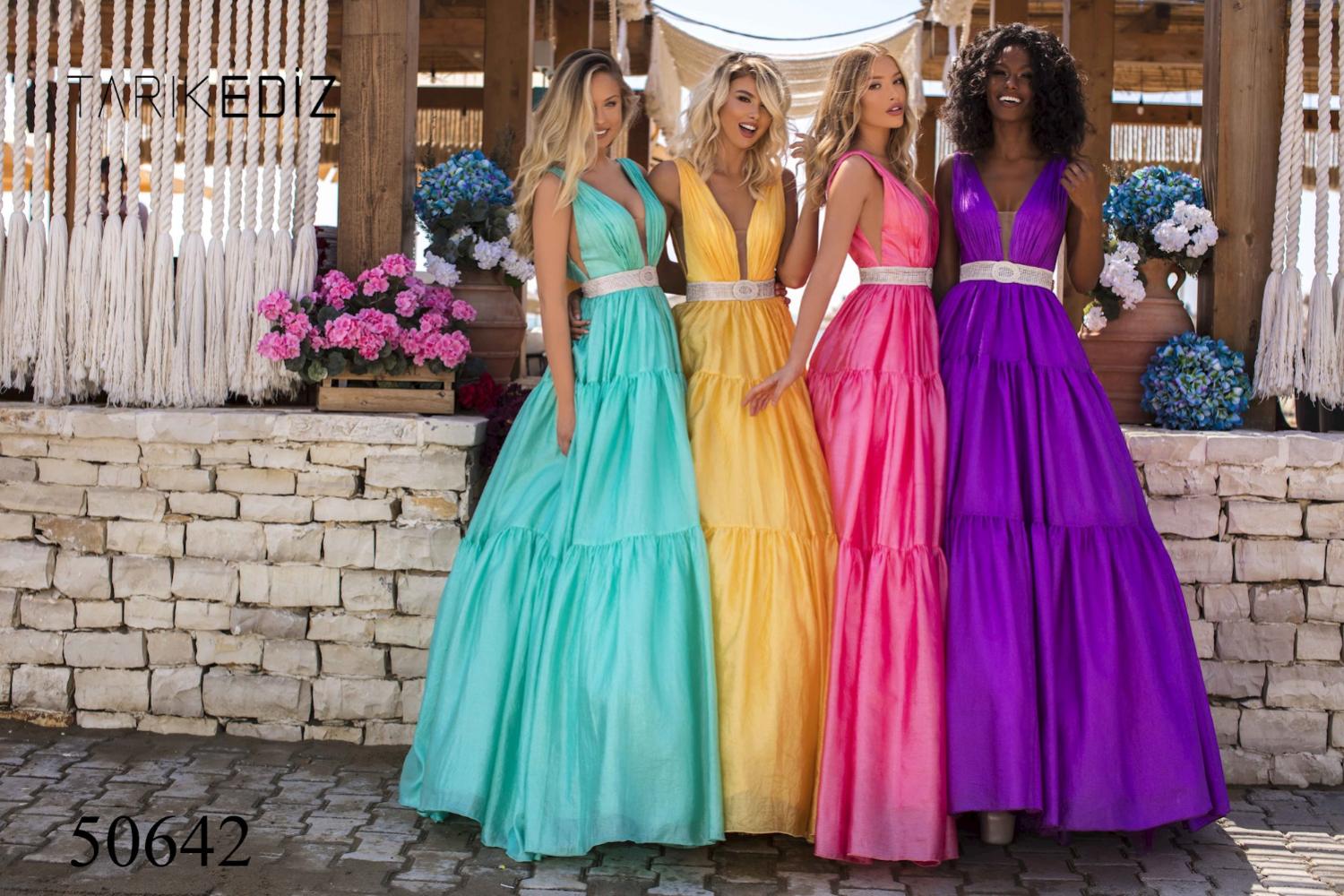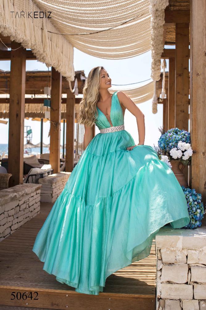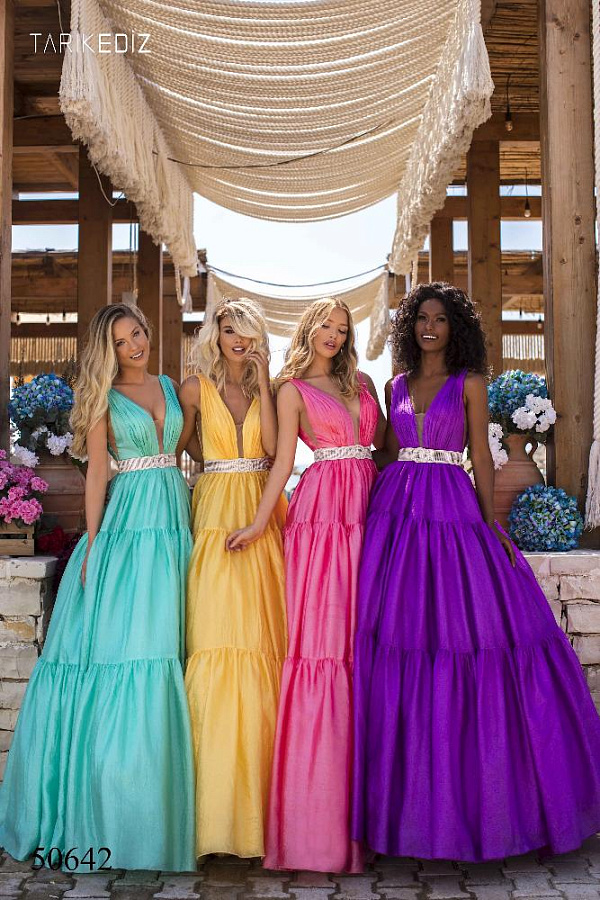 Яркое платья Tarik Ediz 50642 - идеальный выбор для любого предстоящего события.Платье с глубоким V-образным вырезом лифа, с боковыми вырезами, пояс из бисера и страз, который подчеркнет вашу талию, завершающий взгляд падает на многоуровневую юбку, придавая платью веселый и кокетливый вид.