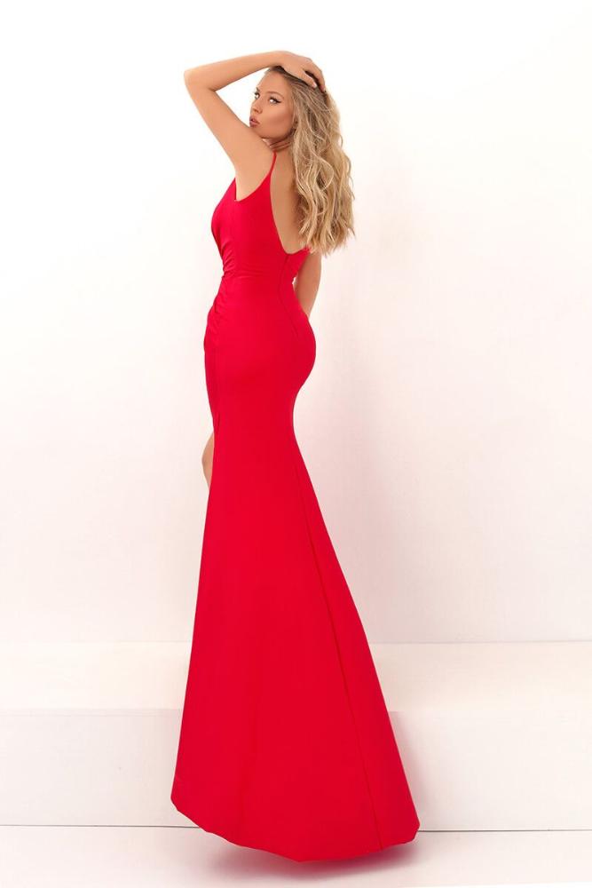 Красное вечернее платье Tarik Ediz 50715 с открытым лифом, тонкими бретельками-спагетти, обрамляющими низкий V-образный вырез и округлую V-образную спинку. Это облегающее платье из джерси дополнено разрезом по правой ноге и шлейфом "лодочка