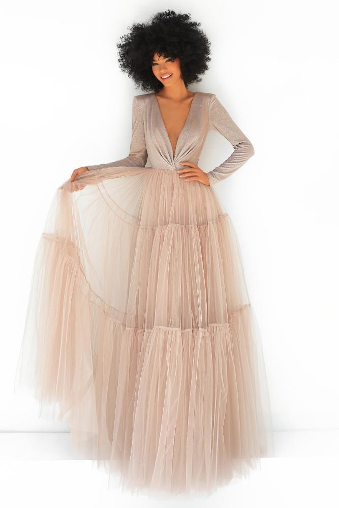Идеальное сочетание трикотажа и легкого прозрачного тюля делает это платье обязательным для выпускного бала. Лиф сдержанный и в то же время невероятно соблазнительный, вырезанный из сверкающего джерси с глубоким V-образным вырезом на спине и юбкой в глубоких ярусах чистого восторга.
