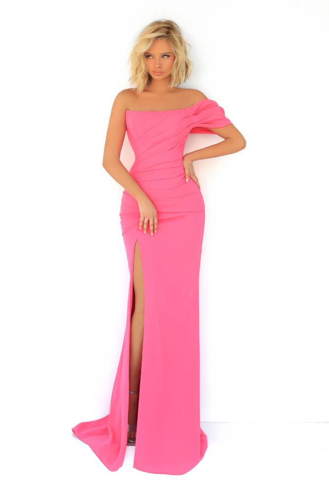 Ярко-розовое платье для выпускного вечера Tarik Ediz 51092 приталенного силуэта со слегка углубленным вырезом, окаймленным драпированным рукавом с открытыми плечами. Великолепная складка спереди придает текстуру этому элегантному вечернему платью с разрезом по правой ноге и шлейфом.