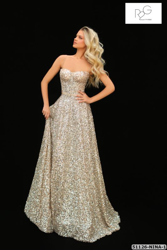 Выпускное платье Tarik Ediz 51126 Nina gold А-силуэта, сплошь усыпанное пайетками, с вырезом в виде сердца, бретельками-спагетти и средней посадкой сзади.