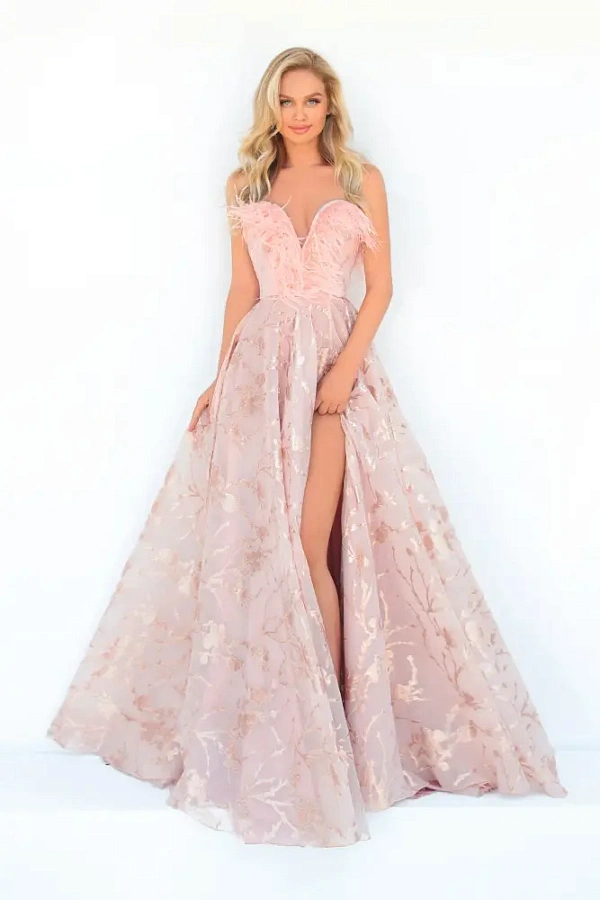 Вечернее платье Tarik Ediz 51153 Gueen нежно розового цвета имеет трапециевидный силуэт из органзы в цветочек, с перьями в тон вдоль глубокого выреза сердечком без бретелек. Это модное платье для выпускного вечера с широким шлейфом украшено разрезом спереди до бедра.