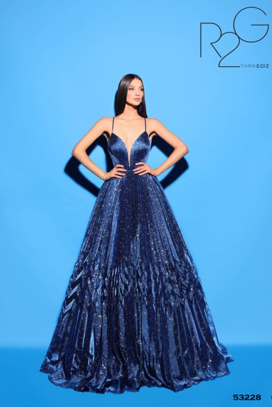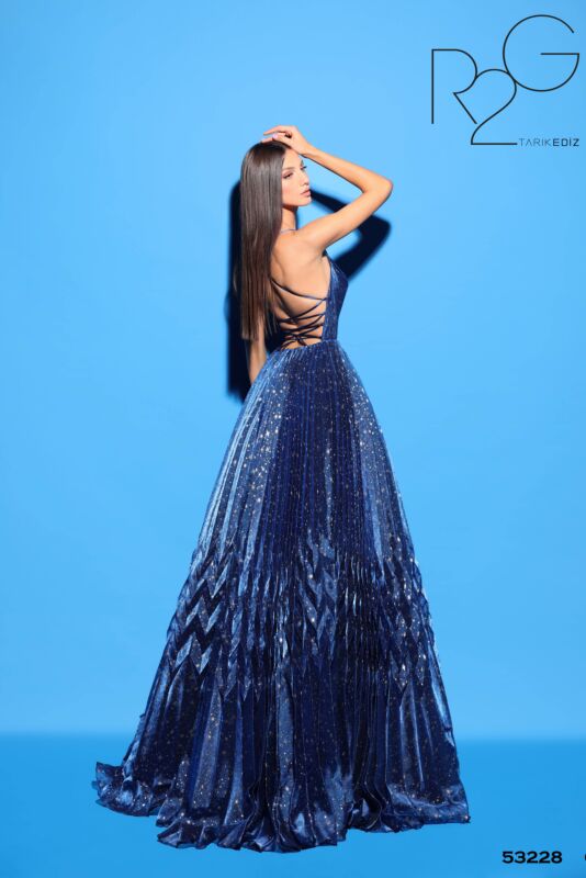 Платье с плиссированной юбкой и глубоким вырезом Tarik Ediz 53228 украшенное блестящими небесными принтами с глубоким вырезом в форме сердца с сетчатой вставкой, на бретельках. Нежные складки придают текстуру этому завораживающему вечернему платью с открытой спиной на шнуровке.