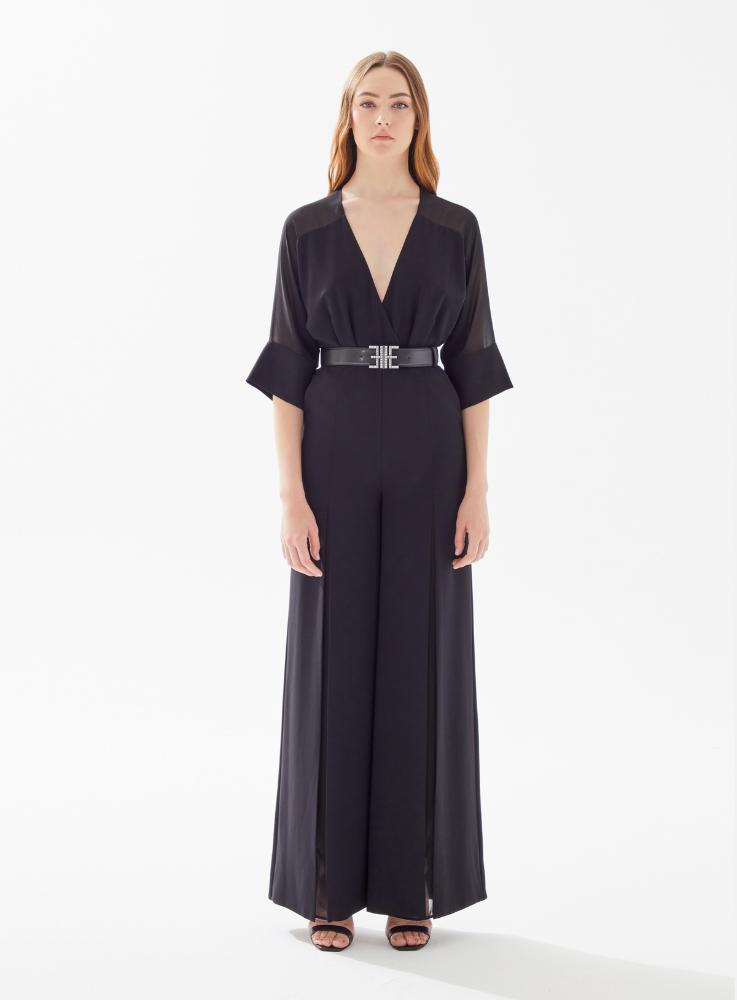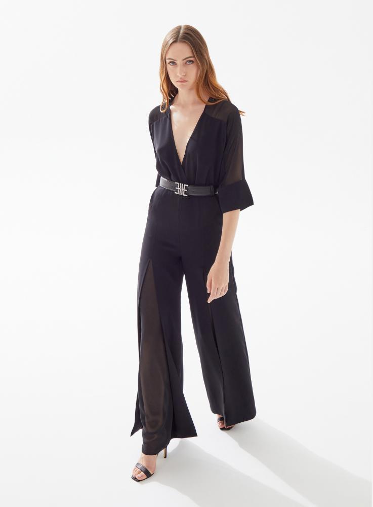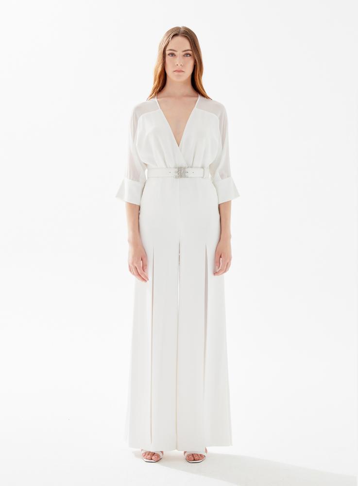 Вечерний комбинезон с V-образным вырезом и прозрачными плечами, поясом и разрезами по бокам