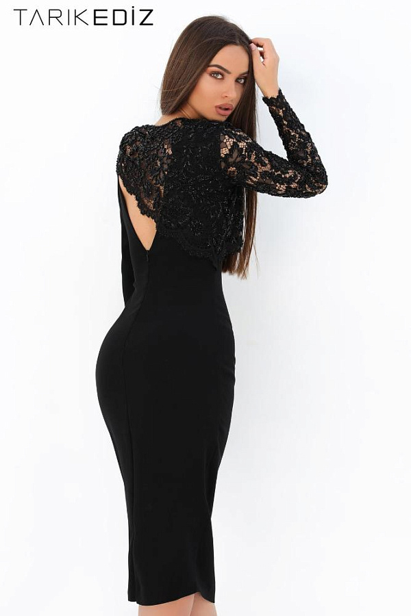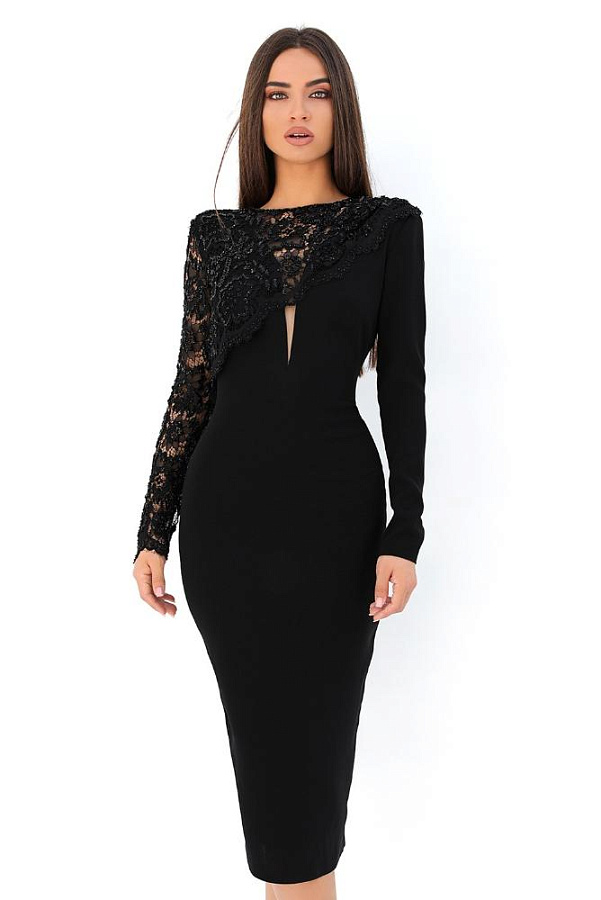 Черное Платье с Кружевным Длинным Рукавом