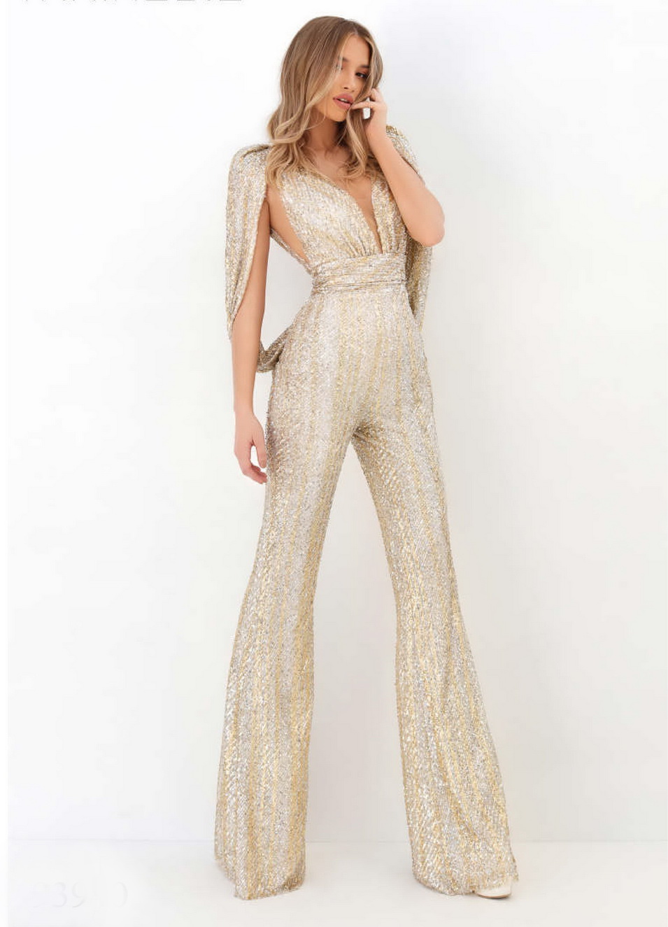 Стильный комбинезон с глубоким вырезом и расклешенными брюками от Tarik Ediz