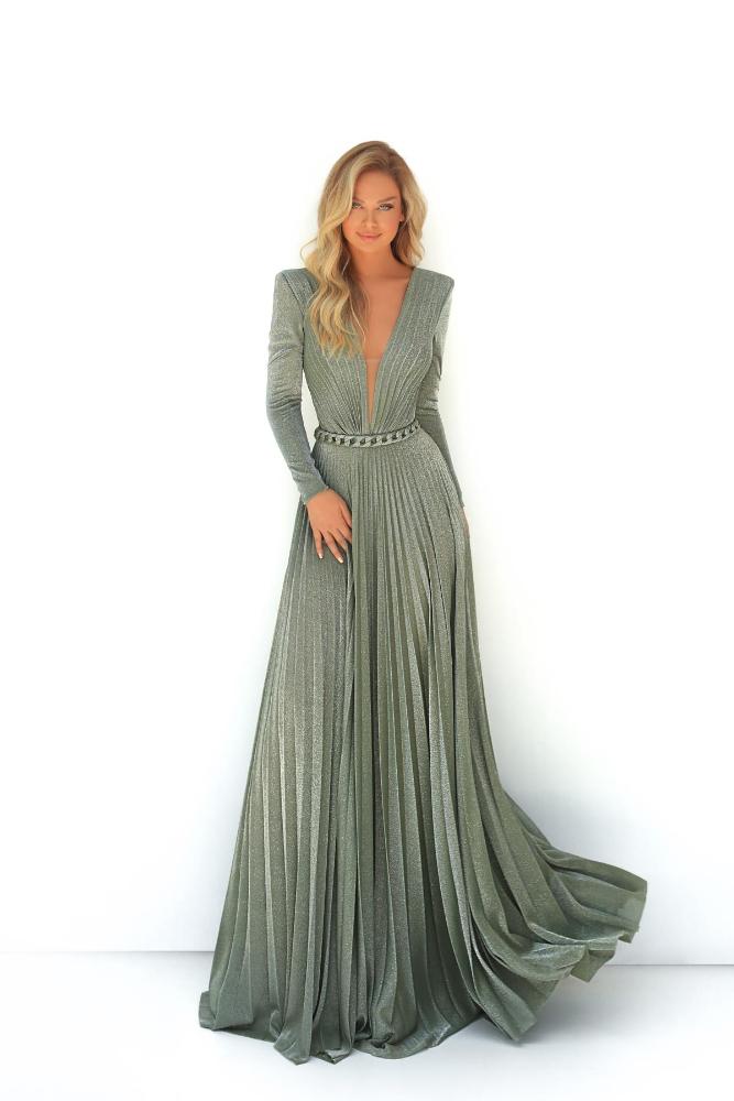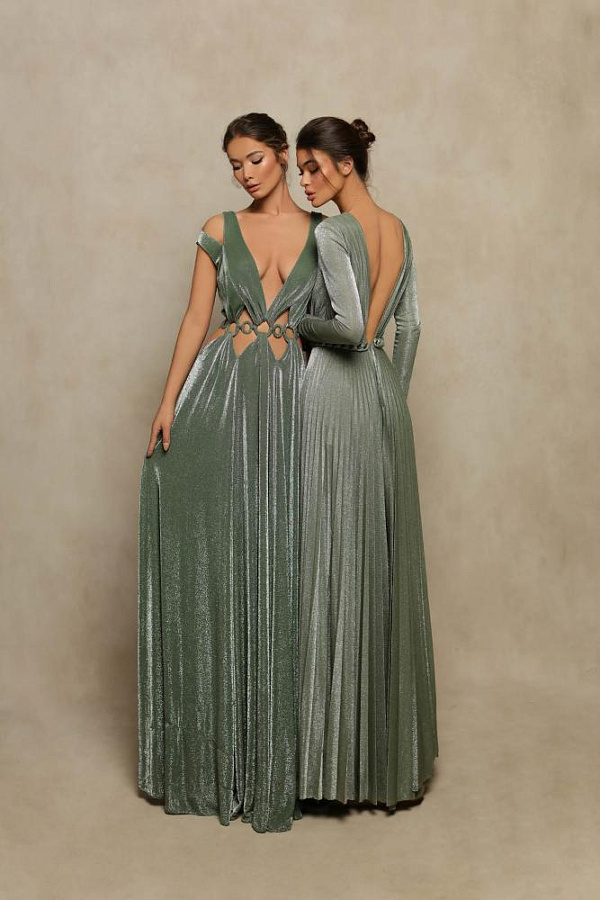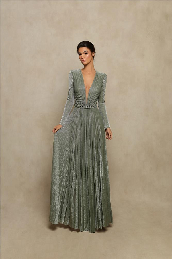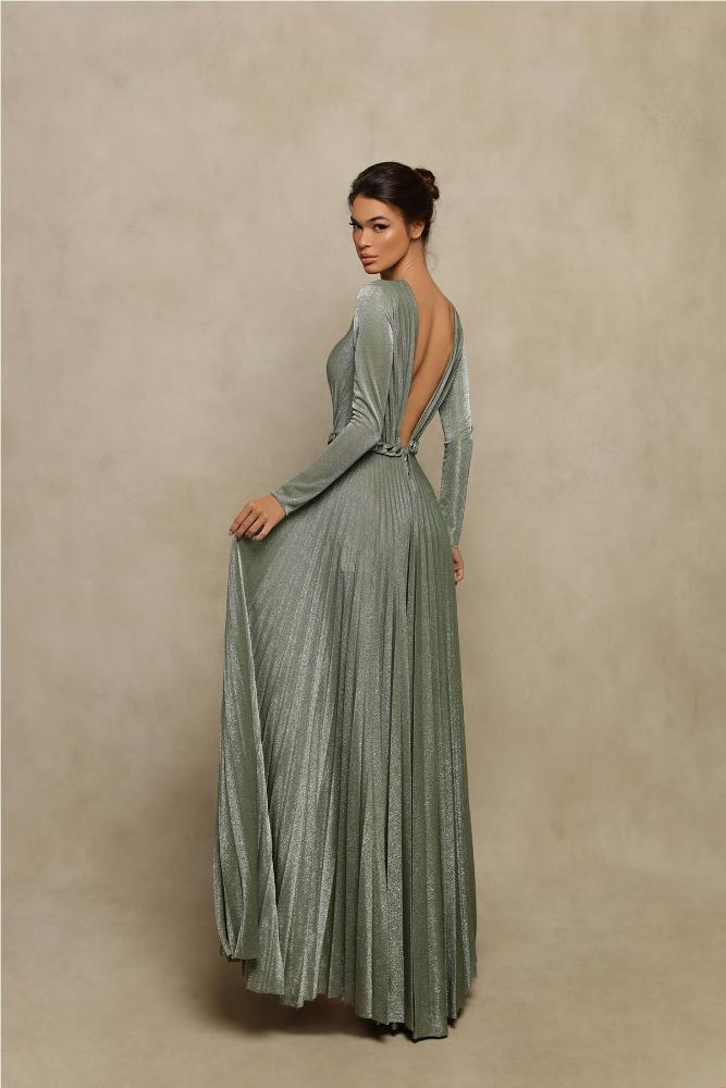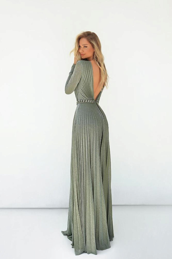 Складки с тонкими краями, выполненные из сверкающего джерси, простираются от плеч до талии, талия подчеркнута эффектным плетеным поясом. Платье с длинными рукавами и эффектной открытой спиной.
