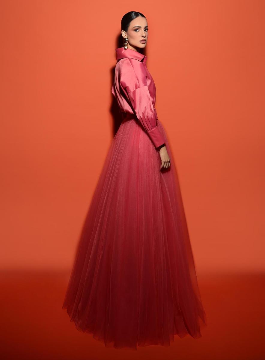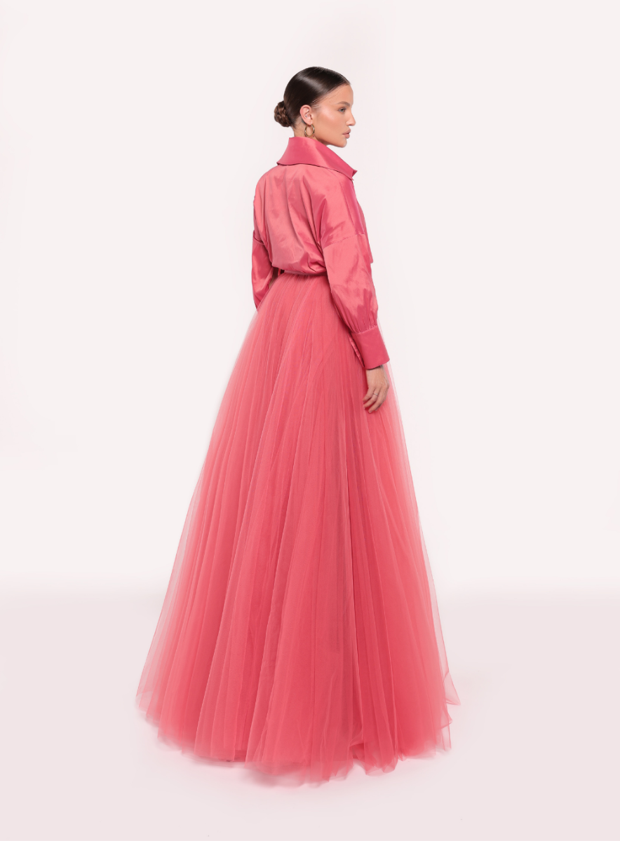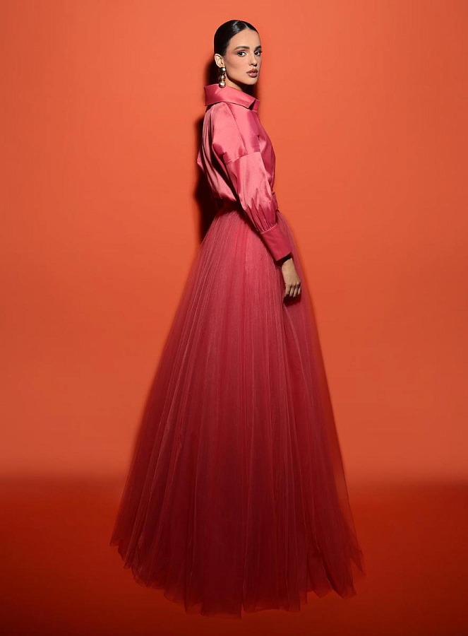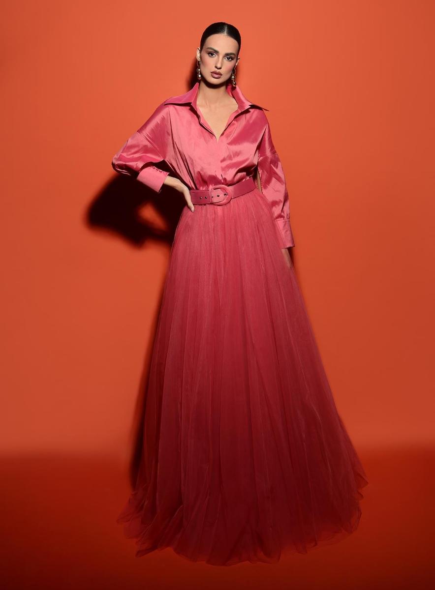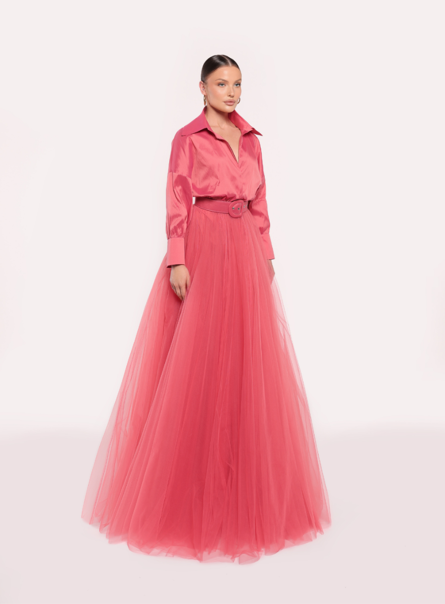 Яркое платье с атласным верхом и длинными рукавами, ниспадающими на лиф, дополнено широким поясом с пряжкой на талии. Вся юбка выполнена из тафты или фатина, которая будет легко струиться на каждой вашей фотографии.