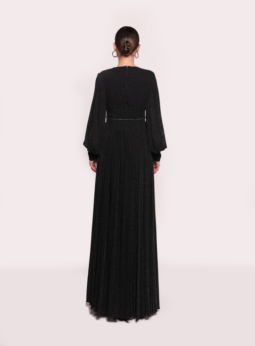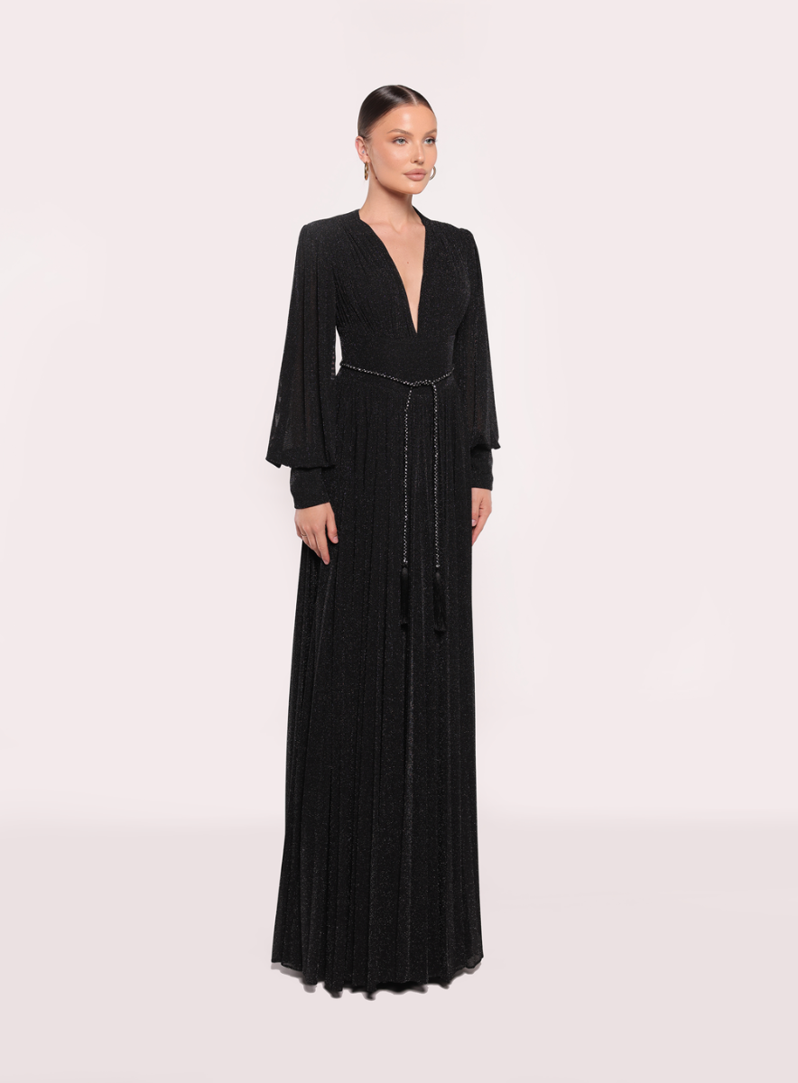 Это элегантное платье с глубоким V-образным вырезом и свободными струящимися рукавами излучает неподвластную времени изысканность. Дизайн дополнен изящным поясом, который придает образу завершенность.