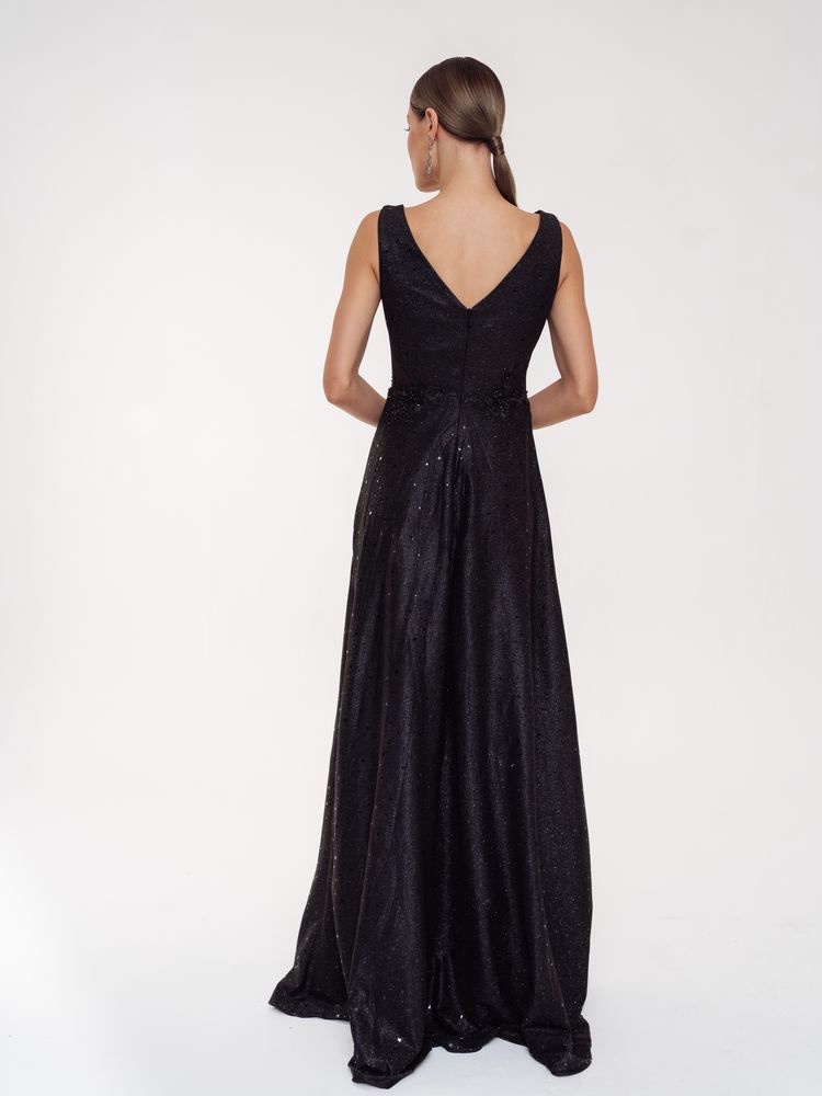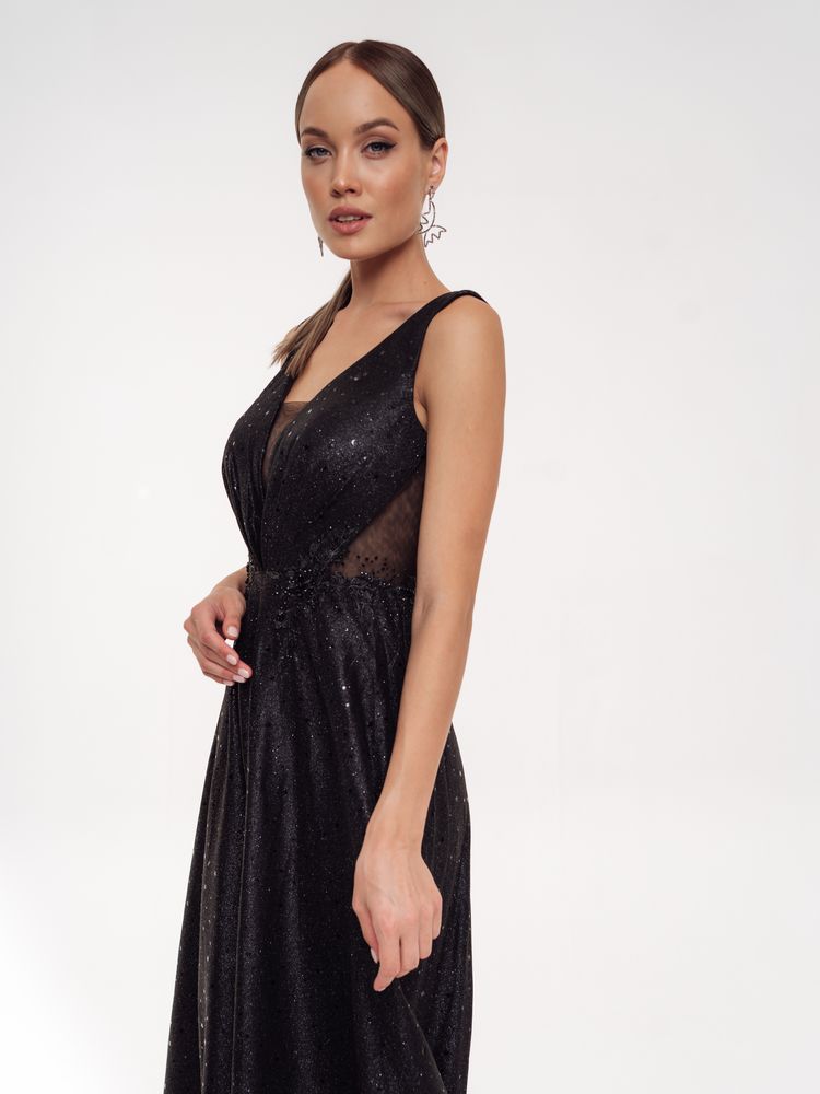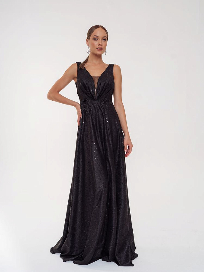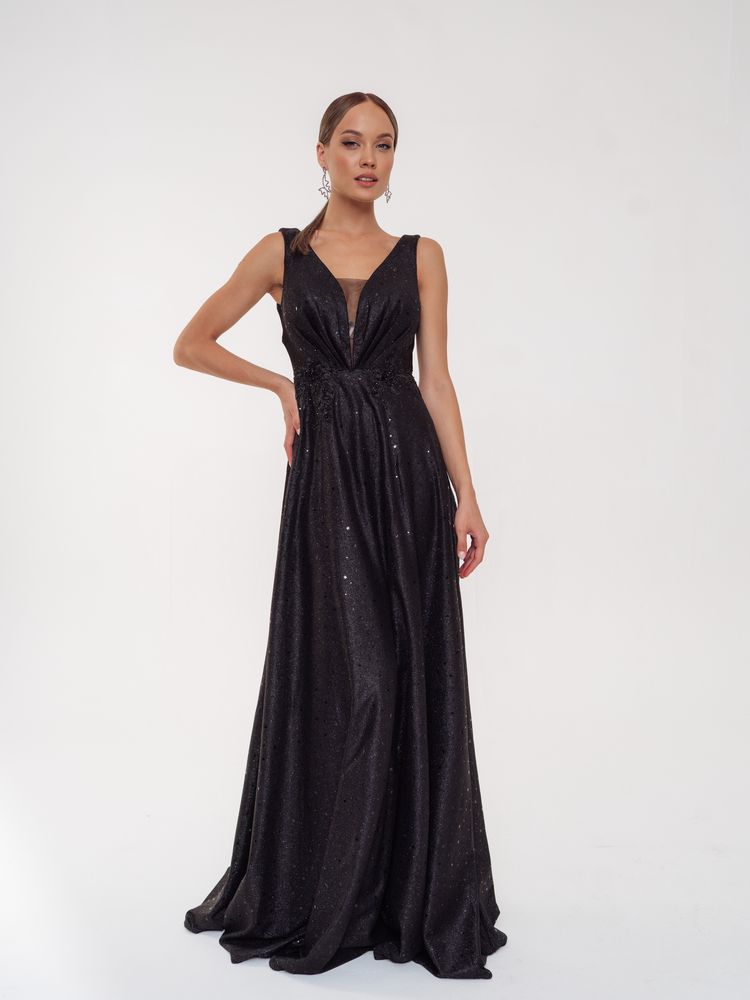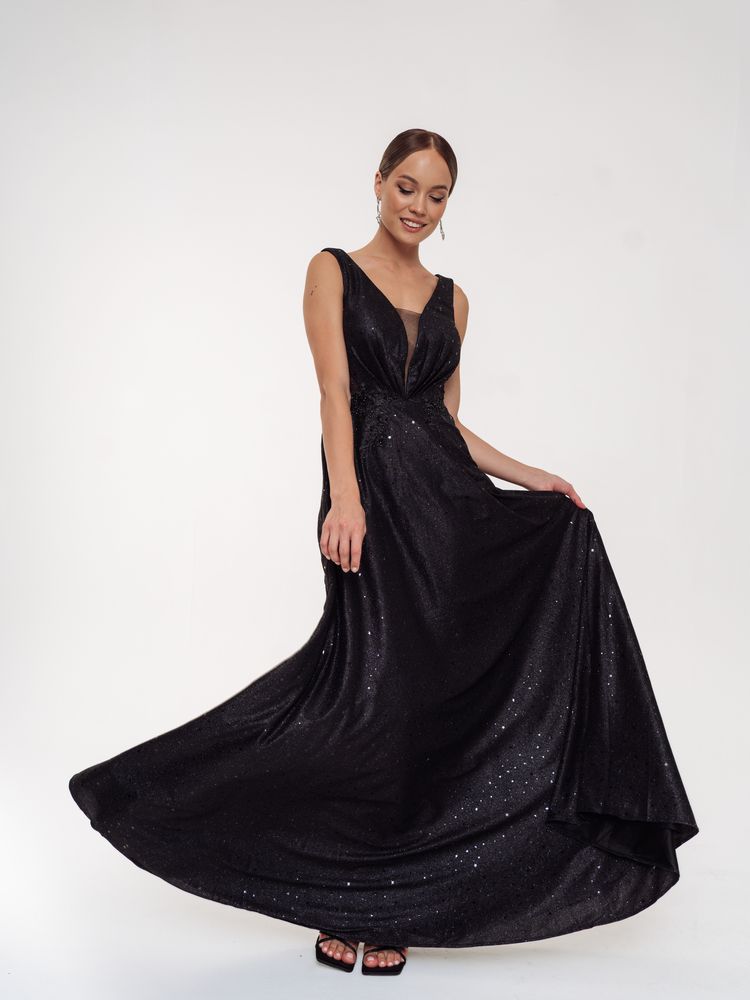 Шикарное платье с глубоким вырезом декольте и прозрачными вставками сбоку по лифу смотрится сексуально и привлекательно.Форма лифа как 2 лепестка,нежно обнимающие фигуру.Расклешенная юбка в пол позволяет удобно двигаться и танцевать. Все платье переливается блеском глиттера из звезд.